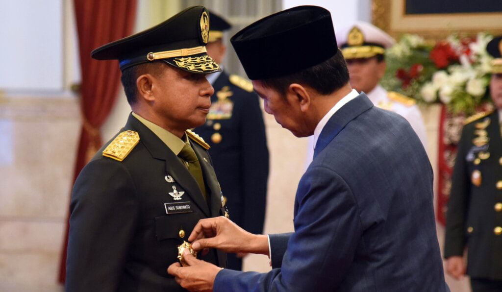 JAKARTA, METRO–Presiden RI Joko Widodo (Jokowi) melantik Jenderal TNI Agus Subiyanto sebagai Panglima TNI, ber­t­empat di Istana Negara, Jakarta, Rabu.