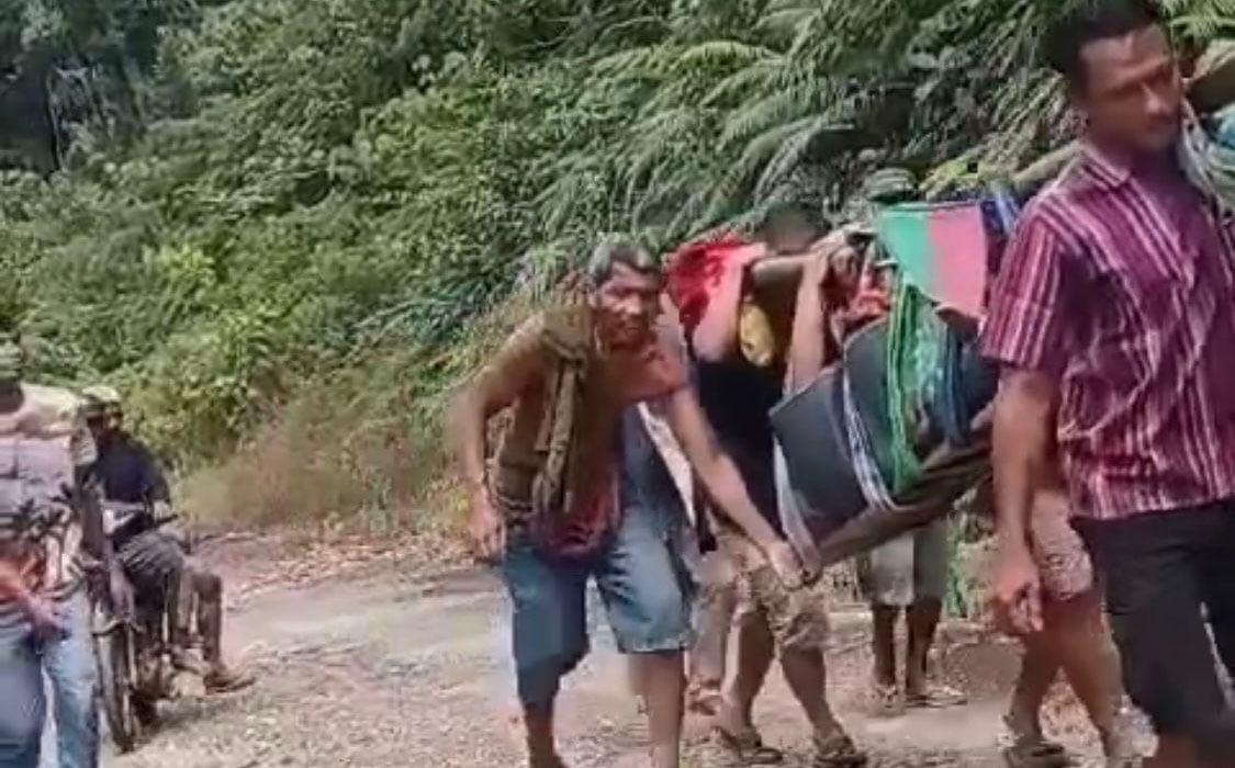 DITANDU— Ibu hamil di Jorong Rurapatontang, Kecamatan Koto Balingka, Pasbar ditandu warga menuju puskesmas karena jalan rusak hingga terpaksa melahirkan di pinggir jalan.