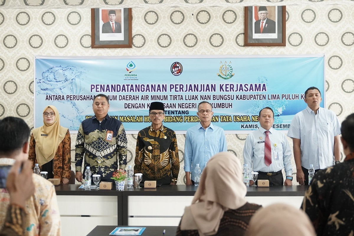 Disaksikan Bupati Limapuluh Kota Safaruddin Dt.Bandaro Rajo, penandatangan Memorandum of Understanding (MoU) antara Direktur Perumda Tirta Luak Nan Bungsu Nofrizen dengan Kepala Kejaksaan Negeri Payakumbuh Slamet Haryanto dilaksanakan pada Kamis, (7/12) di Aula Kejaksaan Negeri Payakumbuh.