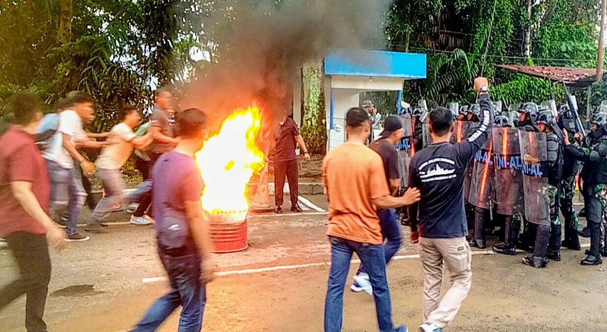 RUSUH—Terlihat beberapa orang perusuh sudah anarkis membakar ban dan berupaya mendobrak pertahanan PHH TNI AL saat mencoba masuk Mako Lantamal II.
