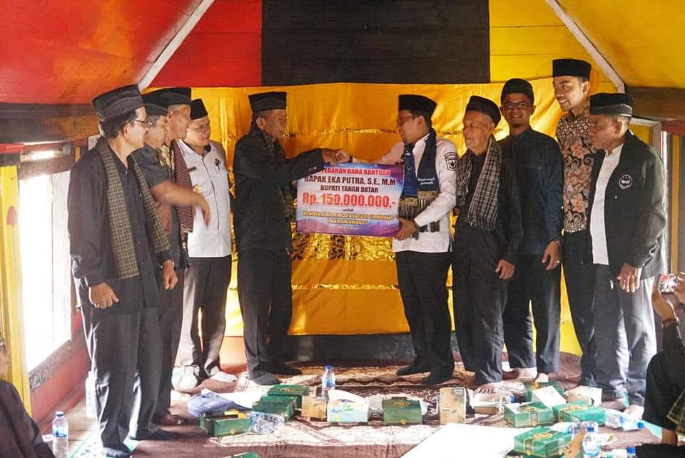 TANAHDATAR, METRO–Bupati Tanah Datar Eka Putra menyerahkan secara simbolis bantuan sebesar Rp150 juta kepada KAN Simawang Kecamatan Rambatan, Rabu (13/12) di balai adat setempat.  Bupati Eka Putra menegaskan, bantuan yang diberikan untuk rehab gedung balai adat Nagari Simawang sebagai bentuk nyata perhatiannya terhadap adat dan budaya di Tanah Datar.  “Balai adat yang representatif dan la­yak digunakan tentunya akan menambah motivasi para ninik mamak untuk melaksanakan aktivitas­nya, termasuk untuk menularkan ilmu adat istiadatnya kepada generasi mu­da, “ terangnya.
