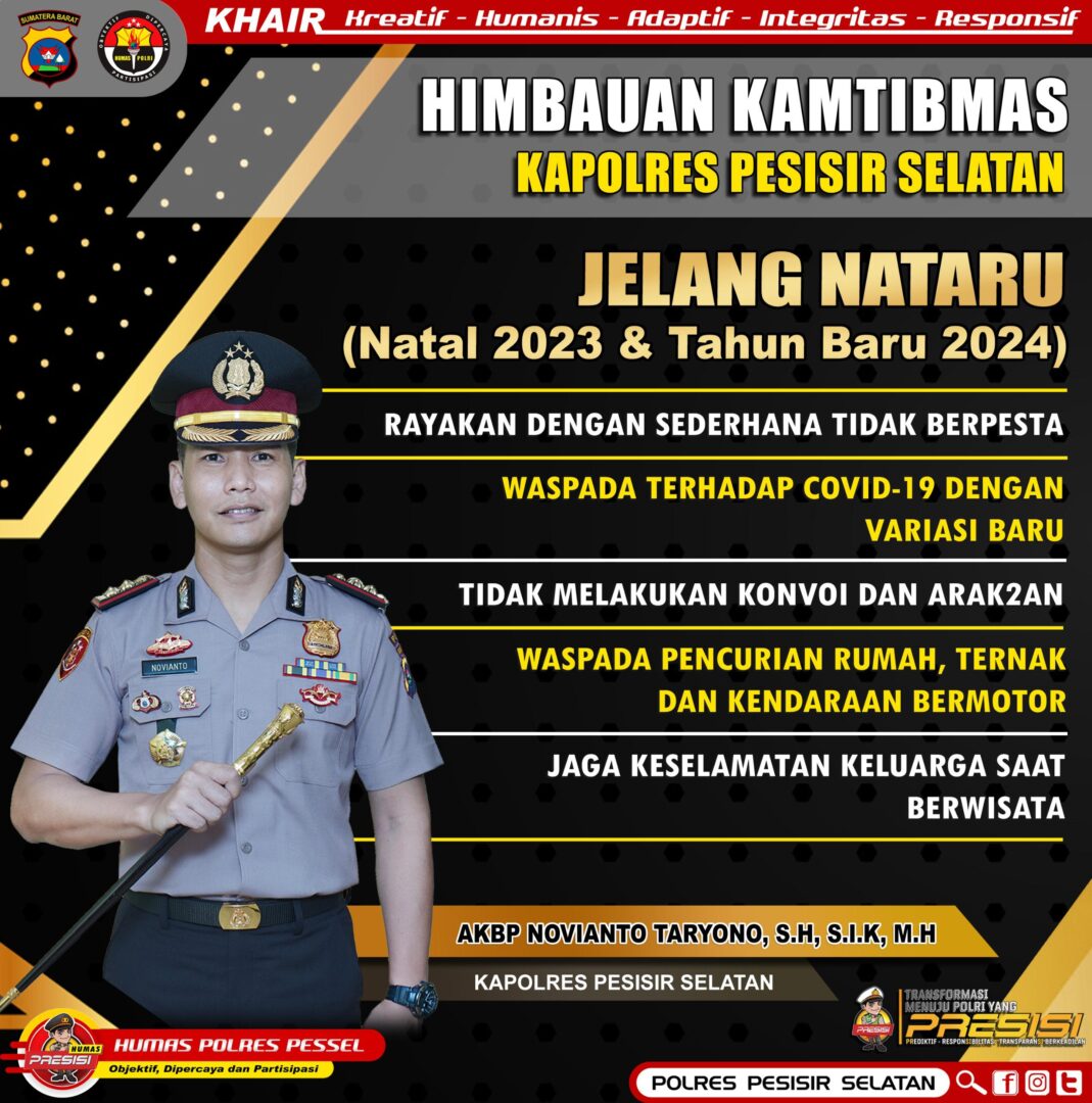 Dalam rangka menjaga situasi Kamtibmasca dan ganguan kriminitas di wiliayah hukum Polres Pesisir Selatan, pada saat natal dan tahun baru. Kapolres Pesisir Selatan AKBP. Novianto Haryono, S. H, M. H. S. I. K menyampaikan himbauan.