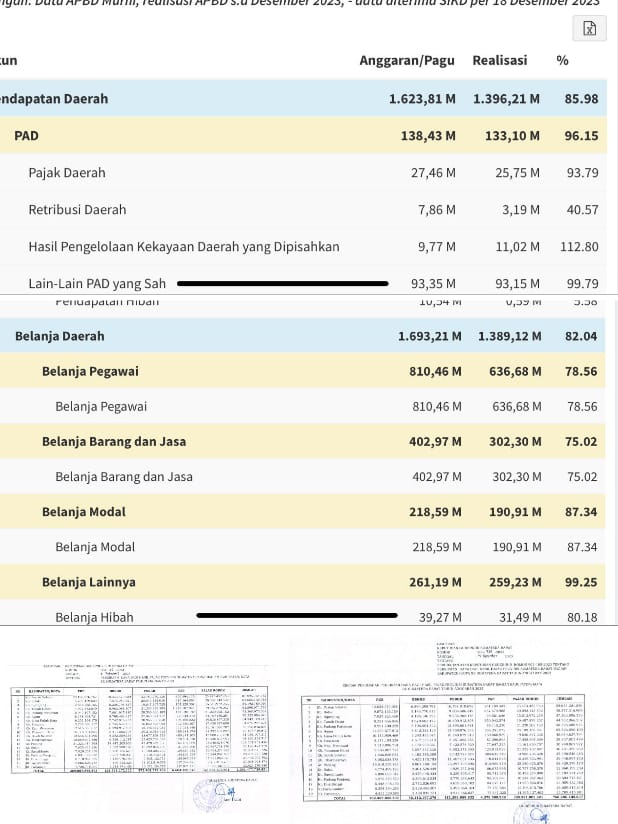 Sementara itu berdasarkan data APBD murni realisasi sampai dengan Desember 2023 data diterima SIKP per 10 Desember 2023 pendapatan daerah anggaran Rp. 1.623,81 M realisasi 1.396,21M dan prosentase 85,98 %.