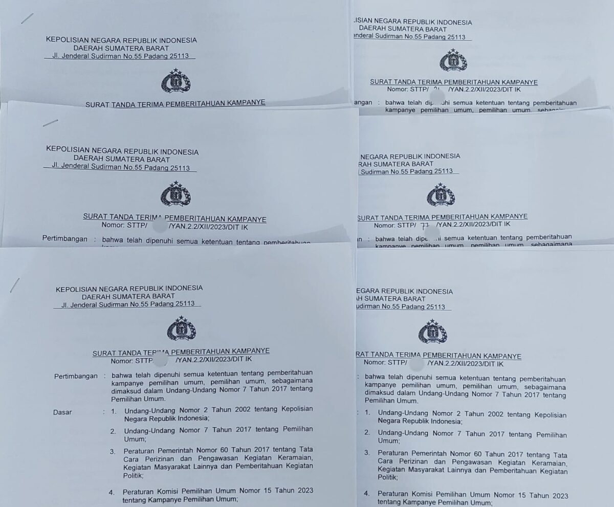 PADANG, METRO–Direktorat Intelijen dan Keamanan (Ditintelkam) Polda Sumatra Barat (Sumbar) hingga Senin (23/1) telah menerbitkan ribuan Surat Tanda Terima Pemberitahuan (STTP) Kampanye Pemilu 2024.