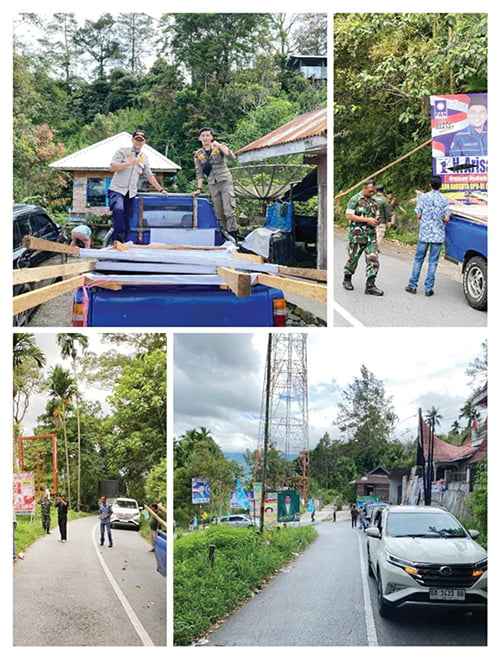 AGAM, METRO–Satuan Polisi Pamong Praja (Satpol PP) Kabupaten Agam melakukan penertiban Alat Peraga Kampanye (APK) yang melanggar aturan, Sabtu (27/1).
