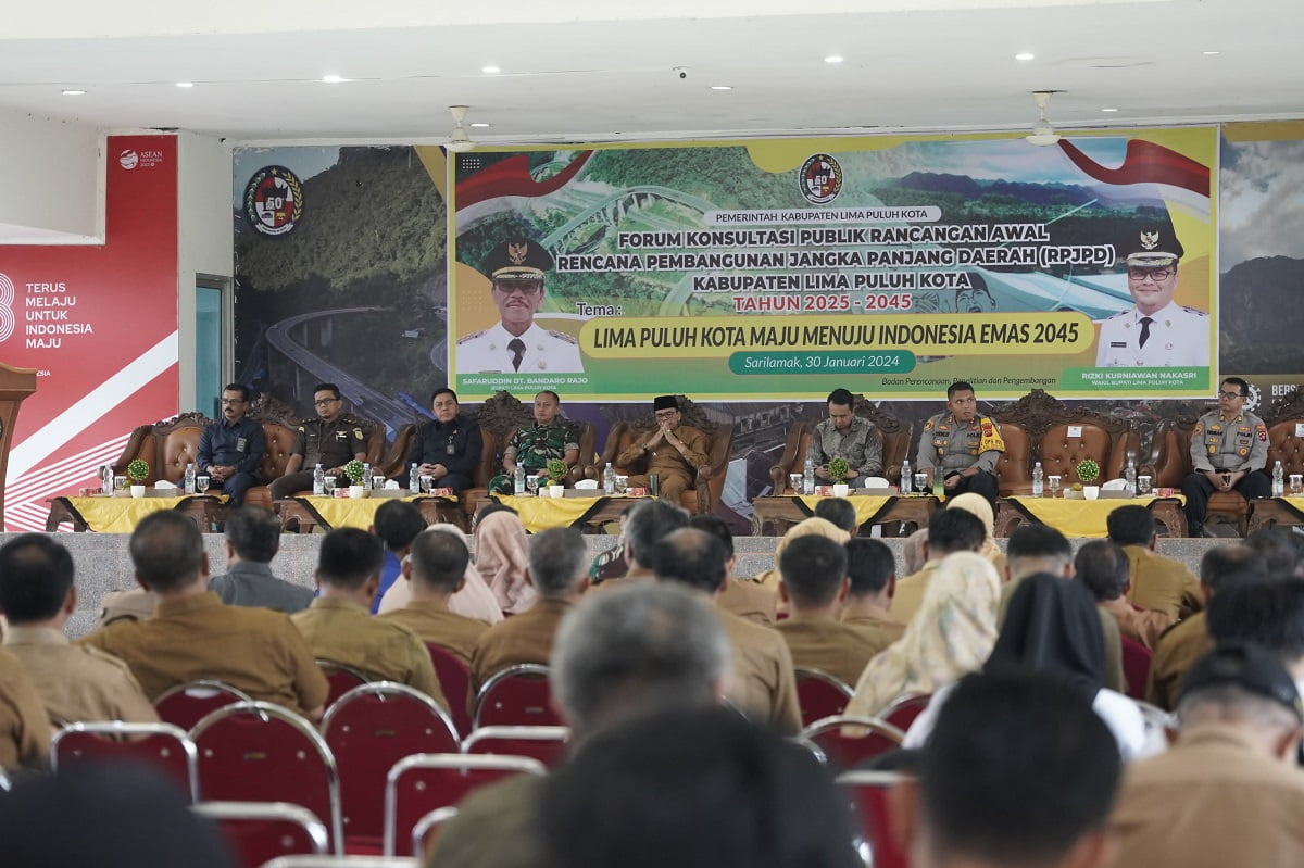 “Forum Konsultasi Pu­blik yang terselenggara diharapkan dapat mewujudkan visi RPJPD 2025-2045 yakni Lima Puluh Kota Madani, Maju, Berbudaya dan Berkelanjutan dalam mendukung gerakan Indonesia Emas 2045,” ungkap Bupati Safaruddin Dt.Ban­daro Rajo saat membuka kegiatan.
