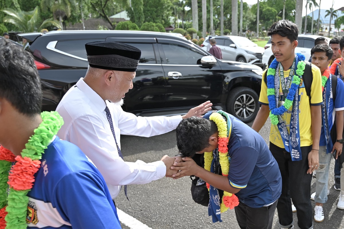 SAMBUT TIM PERSIKOPA— Gubernur Sumatera Barat Mahyeldi sambut pemain Persikopa yang berhasil meraih juara kedua atau runner-up pada ajang nasional Piala Soeratin U-17 di Jawa Timur.