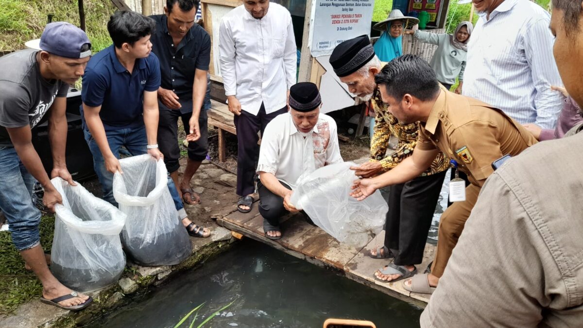 TANAHDATAR, METRO–Masa Tenang, Gubernur Sumbar Lepas Bibit Ikan Banda Gadang. Gubernur Sumbar Mahyeldi Ansyarullah melepas bibit ikan larangan, di Aliran Banda Gadang, Jorong Minang Jaya, Nagari Minang Kabau, Kecamatan Sungayang, Tanahdatar, Senin (12/2) siang.