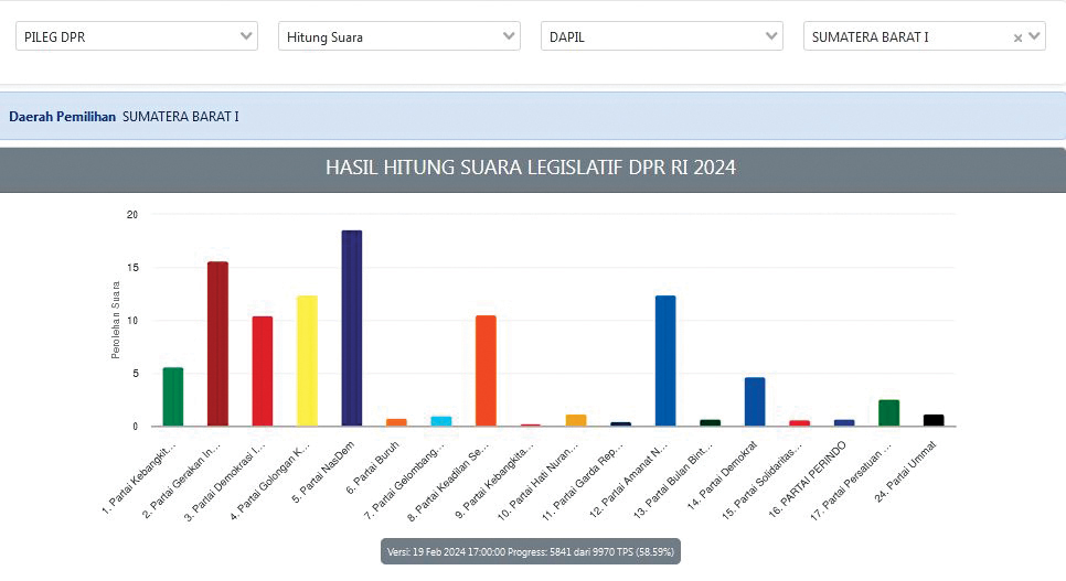 Diketahui, lima hari setelah pencoblosan Pemilu 2024, perhitungan suara real count DPR RI untuk daerah pemilihan Sumatera Barat 1 (Sumbar 1) terus berjalan. Data terbaru dari laman hitung suara KPU RI menunjukkan bahwa 58,59% suara atau 5.841 dari 9.970 TPS telah masuk, pukul 17.00 WIB, Senin (19/2).