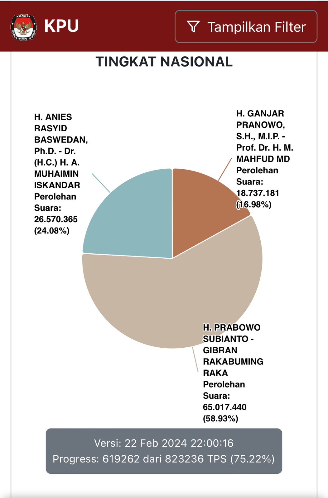 Real count KPU telah dimulai sejak Rabu (14/2) dan telah berlangsung selama delapan hari. Jumlah data yang telah masuk pun beragam dari tiap-tiap wilayah di Indonesia. Hingga berita ini diturunkan, data yang masuk sudah mencapai 619.262 Tempat Pemungutan Suara (TPS) dari 823. 236 TPS atau 75,22 persen.