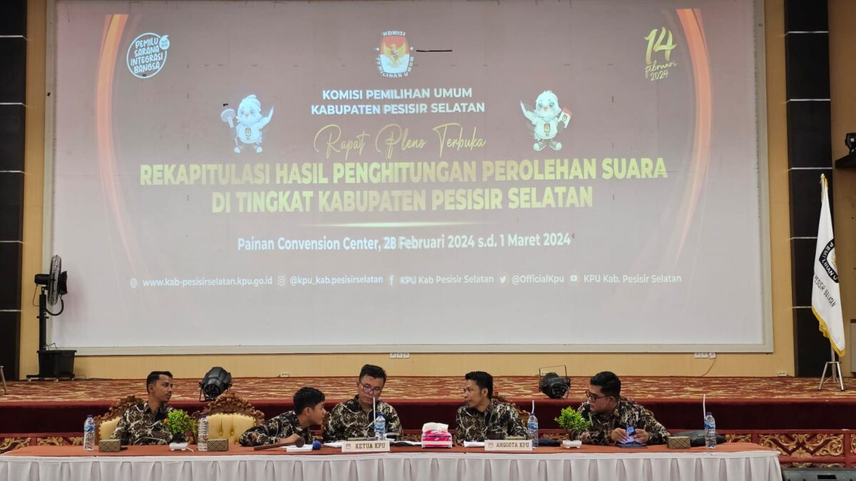 Disampaikan, rekapitulasi penghitungan perolehan suara ditingkat Kabupaten Pesisir Selatan dilaksanakan selama tiga hari, mulai hari ini Rabu 28 Februari hingga 1 Maret 2024.