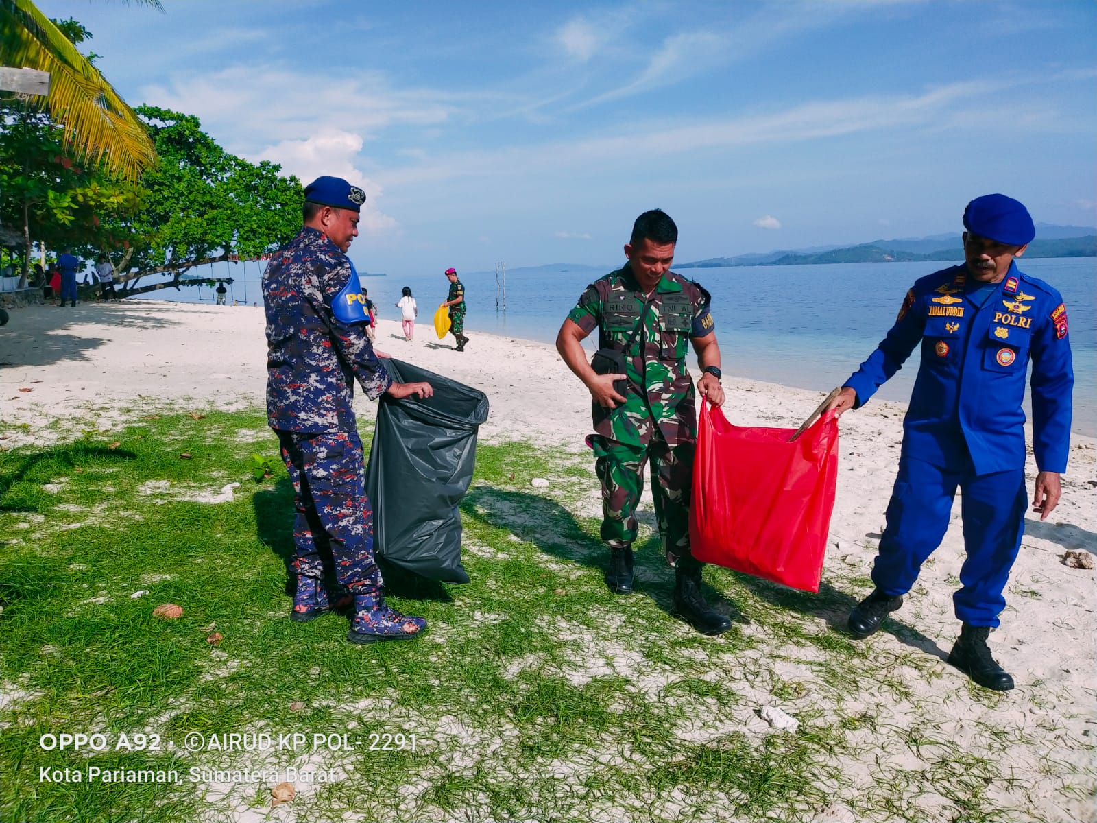 PESSEL METRO–Baharkam Polri , melalui Sat Polairud, Polres Pesisir Selatan bersama unsur Maritim Angkatan Laut, Istansi terkait, dan masyarakat nelayan, pengelola objek wisata. Sapu bersih kawasan Pulau Cingkuak, Carocok Painan, Kabupaten Pesisir Selatan.