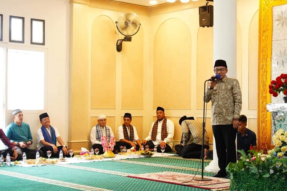 SAMBUTAN— Bupati Tanahdatar Eka Putra memberikan sambutan dan apresiasi terhadap pelaksanaan khatam Al Quran gratis di Masjid Al Faizin Pincuran Tujuh Nagari Baringin, Kecamatan Lima Kaum.