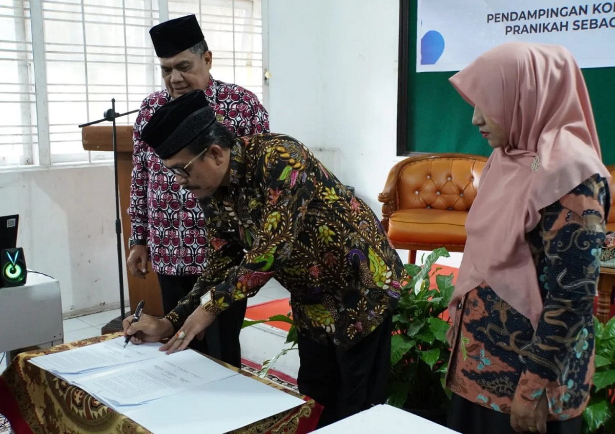 TEKEN KOMITMEN— Tiga instansi melakukan penandatanganan Komitmen Bersama Pendampingan Konseling dan Pemeriksaan Kesehatan Tiga Bulan Pranikah, Kamis (21/3) di Aula Dinas Sosial PPKBPPPA.