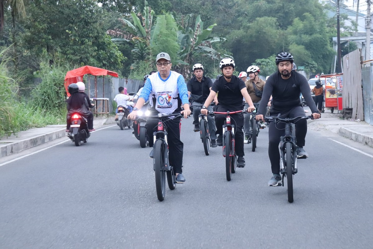 SAFARI RAMADHAN—Wagub Audy bersepeda dalam rangkaian Safari Ramadhan di Payakumbuh bersama PJ Wali Kota Jasman.