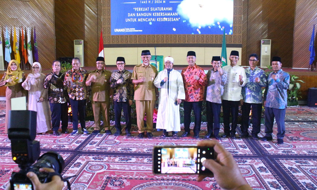 HALAL BIHALAL— Rektor Unand, Efa Yonedi dan jajaran civitas Akademika, serta mantan Rektor Unand, berfoto bersama dengan Gubernur Sumbar Mahyeldi, Ketua MUI Sumbar, Buya Gusrizal Gazahar, saat halal bihalal, di gedung Auditorium Unand, Selasa (16/4).