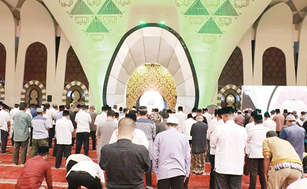 SHALAT BERJAMAAH— Sejumlah jamaah mengikuti shalat berjamaah di Masjid Raya Sumbar. Saat ini Pemprov Sumbar berencana menambahkan nama masjid ini menjadi “Masjid Raya Syekh Ahmad Khatib Al-Minangkabawi”.