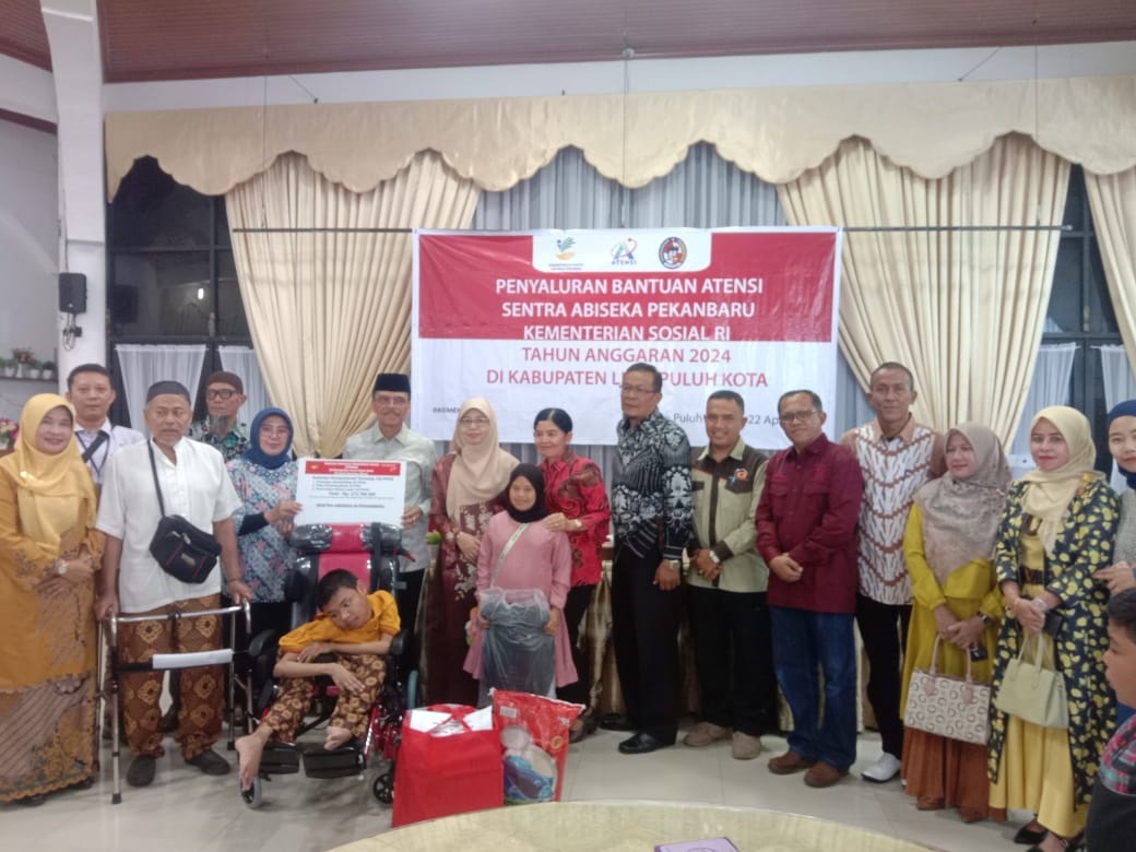 LIMAPULUH KOTA, METRO–Sebanyak 154 masyarakat Kabupaten Lima Puluh Kota Pemerlu Pelayanan Kesejahteraan Sosial (PPKS) menerima bantuan Atensi dari Kementerian Sosial (Kemensos) RI melalui Sentra Abiseka Pekanbaru, Minggu (21/4). Dalam sambutannya pada acara yang digelar di Pandopo Rumah Dinas Bupati kawasan Labuah Basilang, Bupati Safaruddin Dt. Bandaro Rajo mengapresiasi dan mengucapkam terima kasih kepada Kemensos RI yang telah menyalurkan bantuan Atensi melalui Sentra Abiseka Pekanbaru.