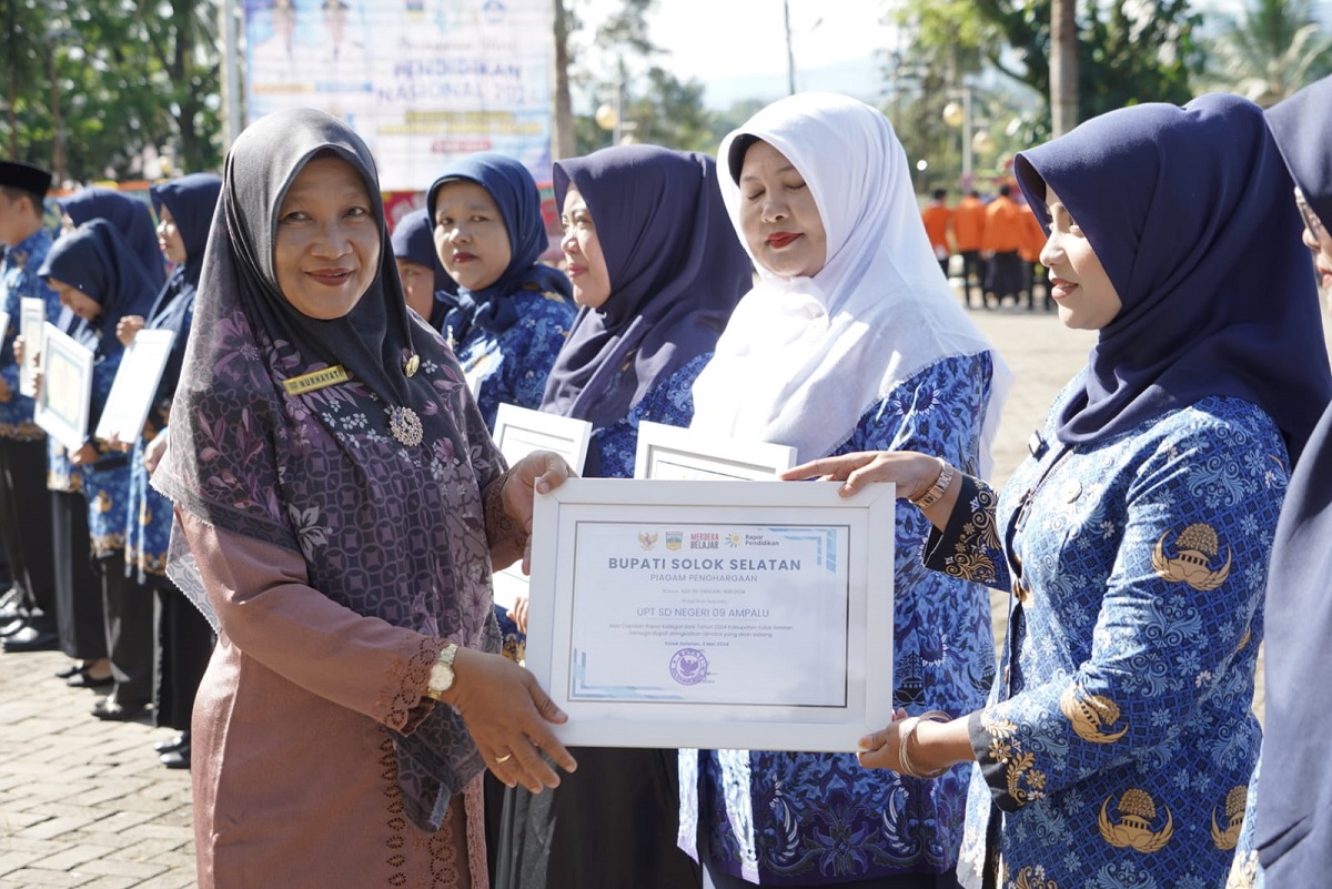 PADANG ARO, METRO–Pemerintah Kabupaten Solok Selatan memperingati Hari Pendidikan Nasional dengan melaksanakan upacara sekaligus menyerahkan berbagai penghargaan bagi Lembaga Pendidikan dan Tenaga Pendidik berprestasi. Kegiatan ini dilaksanakan di Halaman Kantor Bupati Solok Selatan, Kamis (2/5).