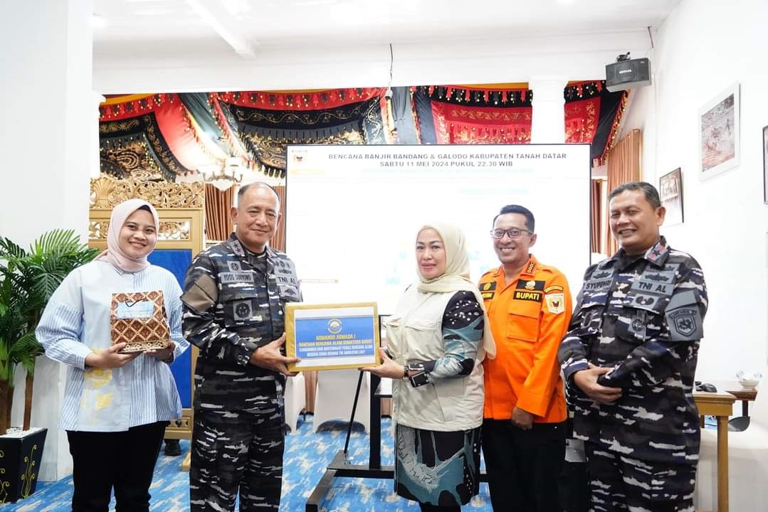 TANAHDATAR, METRO–Panglima Komando Armada I (Pangkoarmada I) Laksamana Muda (Laksda) TNI Yoos Sur­yono didampingi Danlantamal II Laksamana Pertama Yufendri menyerahkan bantuan bagi korban musibah banjir bandang dan longsor di Tanah Datar. Bantuan sebesar Rp50 Juta bersama bantuan logistik lainnya diterima secara simbolis Bupati Tanah Datar Eka Putra didampingi Sekda Iqbal Ramadi Payana, Ketua TP PKK Ny. Lise Eka Putra, Kamis (23/5) di Posko Utama Bencana di Indojolito Batusangkar.