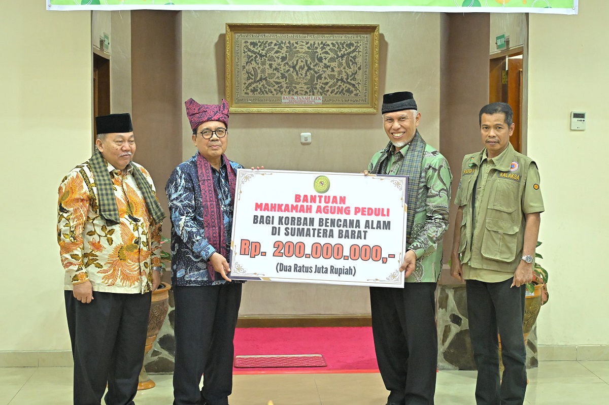 PADANG, METRO–Gubernur Sumatera Barat (Sumbar), Mahyeldi Ansharullah, menerima penyaluran bantuan senilai Rp446,7 juta dari Mahkamah Agung (MA) untuk penanganan bencana baniir lahar dingin dan longsor di Sumbar. Gubernur menyatakan, dukungan MA dan banyak pihak lain sangat berarti besar dalam upaya pemulihan pascabencana di Sumbar.