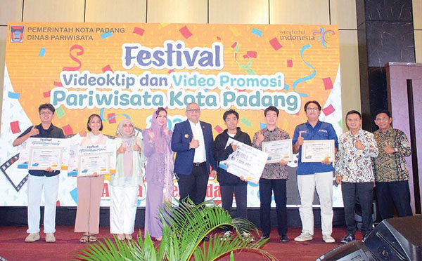 PJ Wali Kota Padang, Andree Algamar, Pj Ketua Dekranasda Padang, Vanny, Anggota DPRD Padang Irawati Meuraksa, Kepala Dinas Pariwisata Padang, Yudi Indra Syani, Asisten II Kota Padang, Didi Aryadi bersama pemenang Lomba Video Promosi Pariwisata Kota Padang.