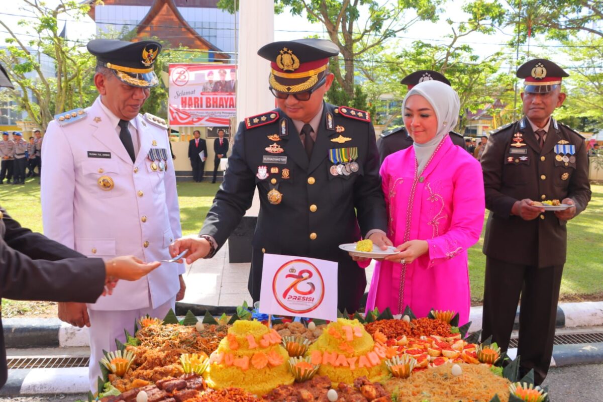 PESSEL METRO–Upacara hari ulang tahun Bhayangkara Ke -78, digelar jajaran Polres Pessel, Senin (1/6/2024) di halaman Kantor Bupati Pessel diwarnai pemotongan tumpeng.
