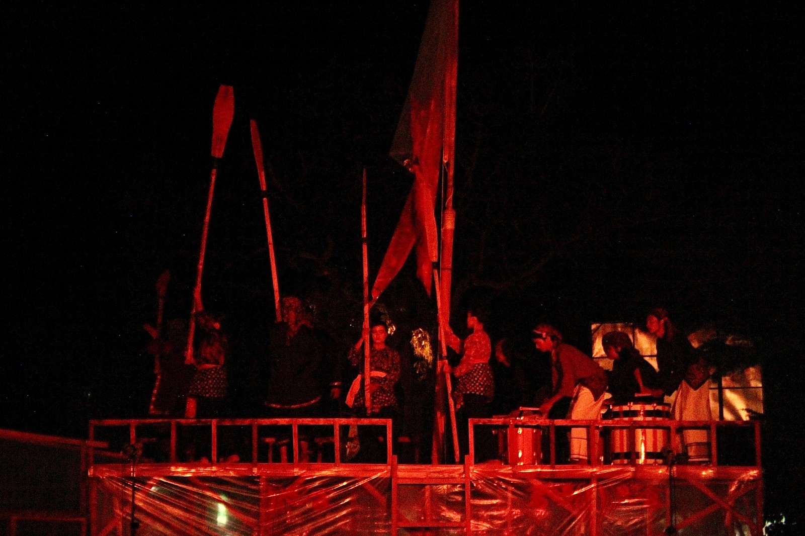 Pertunjukan diawali oleh seorang perempuan cantik yang menari dari pojok kanan panggung. Ia berdendang sambil menari-nari. Pandangan matanya seperti sedang mencari-cari sesuatu. Lalu muncul rombongan masuk dari kiri dan kanan panggung yang membawa benda seperti potongan-potongan bingkai yang dibalut plastik kaca. Bergerak menuju tengah panggung. Komposisi musik vokal dan tari yang berpadu itu kemudian mengantarkan penonton pada dua kapal besar sebagai setting panggungnya.