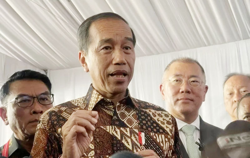 WAWANCARA— Presiden RI Joko Widodo diwawancarai wartawan usai peresmian pabrik baterai dan ekosistem kendaraan listrik PT HLI Green Power.