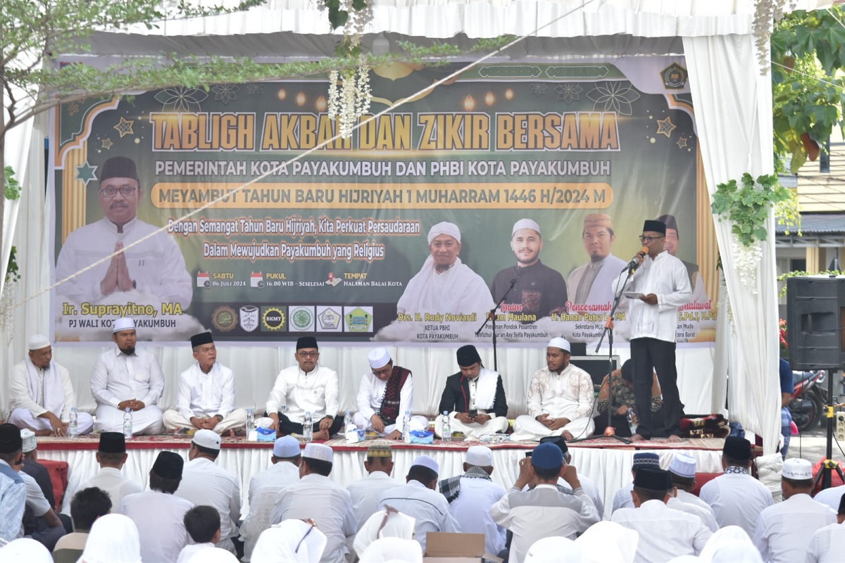 POLIKO, METRO–Penjabat (Pj) Wali Kota Payakumbuh Ir. Suprayitno, MA menghadiri tabligh akbar dan dzikir bersama dalam rangka menyambut Tahun Baru Hijriah 1 Muharram 1446 H di Halaman Balai Kota Payakumbuh, Sabtu (6/7) sore. Tabligh akbar dan dzikir bersama Pemko dan PHBI Kota Payakumbuh tersebut mengusung tema ‘De­ngan Semangat Tahun Ba­ru Hijriyah, Kita Perkuat Per­saudaraan Dalam Me­wujudkan Payakumbuh yang Religius’. “Kami dari Pemko menyampaikan terima kasih kepada PHBI Payakumbuh yang telah berkenan menyelenggarakan acara tabligh akbar dan dzikir bersama ini,” ujar Pj Wako Suprayitno.
