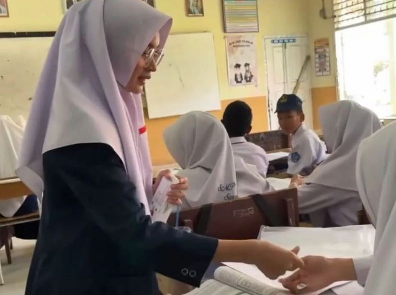 SERAHKAN TTD— Duta Genre Sawahlunto Tahun 2024 Diarra Ufaira menyerahkan Tablet Tambah Darah (TTD) kepada siswi SMPN 1 Sawahlunto dalam gerakan Remaja Cegah Anemia (RAGAMI), baru-baru ini.