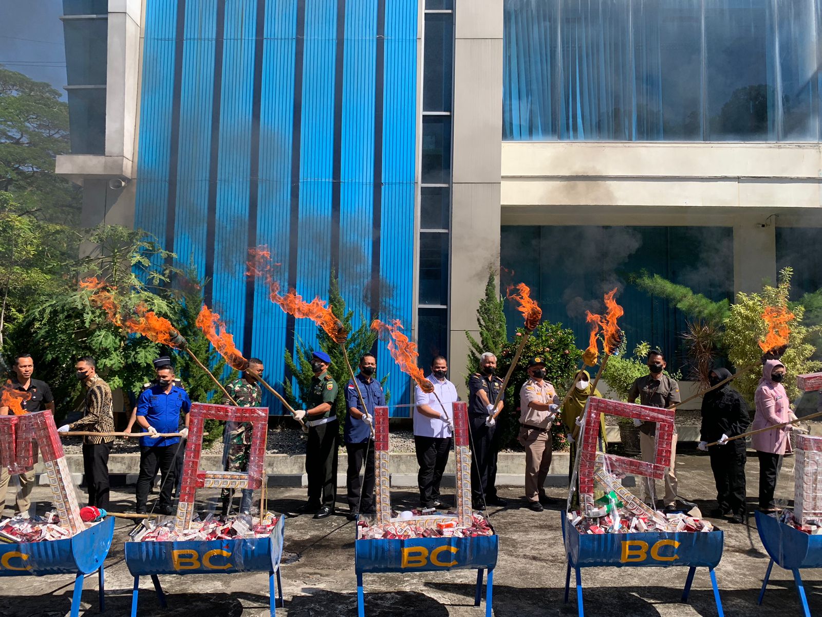 “Selain rokok, kami juga musnahkan minuman mengandung etil alkohol (MMEA) yang melanggar ketentuan di bidang cukai sejumlah 32,85 liter dan barang hasil penindakan lainnya sejumlah 2 bungkus susu bubuk dan 3 unit monitor alat kesehatan,” tegas dia.