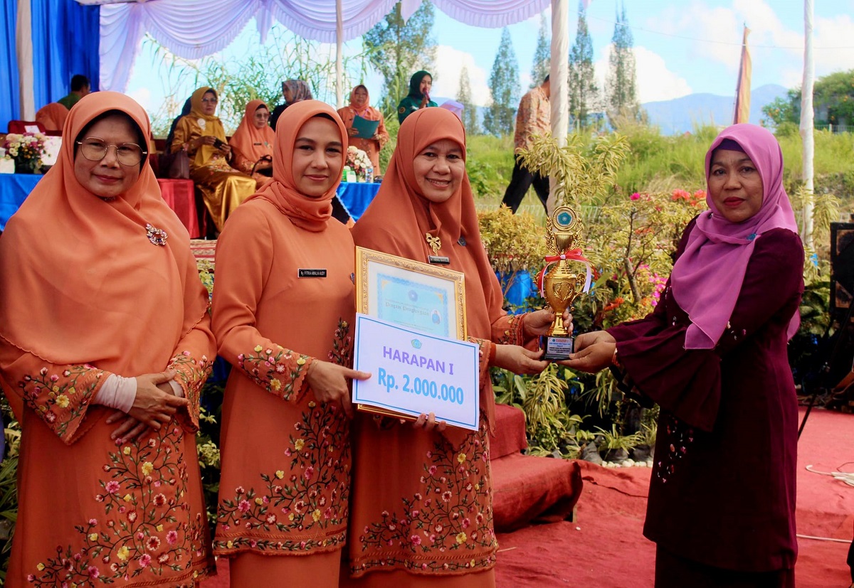 SERAHKAN HADIAH— Ketua TP PKK Sumbar Harneli serahkan hadiah piala pada Ketua TP PKK Pasbar Ny. Titi Hamsuardi.