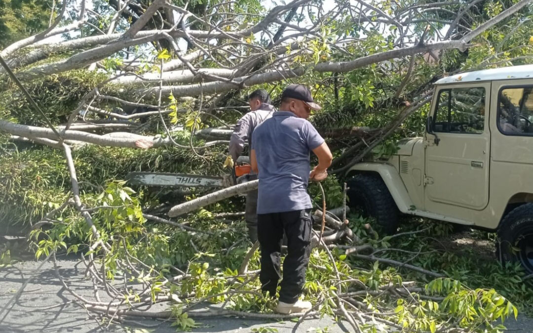 “Pohon tumbang terjadi lantaran adanya pelapukan pada akar pohon sehingga menyebabkan akses jalan tertutup dan menimpa mobil yang sedang terparkir,” kata Hendri Zulviton.