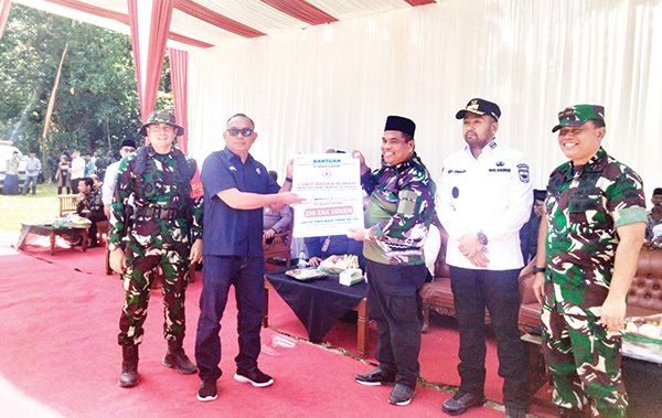 PADANG, METRO–PT Semen Padang menyerahkan bantuan 1 unit bedah Rumah Tidak Layak Huni (RTLH) dan 250 sak semen secara simbolis usai Upacara Pembukaan TNI Manunggal Membangun Desa (TMMD) ke-121 Tahun 2024 di Wilayah Kodim 0308/Padang Pariaman di Lapangan Bola, Korong Sungai Sirah, Nagari Kuranji Hulu, Kecamatan Sungai Geringging, Kabupaten Padang Pariaman, Rabu (24/7).