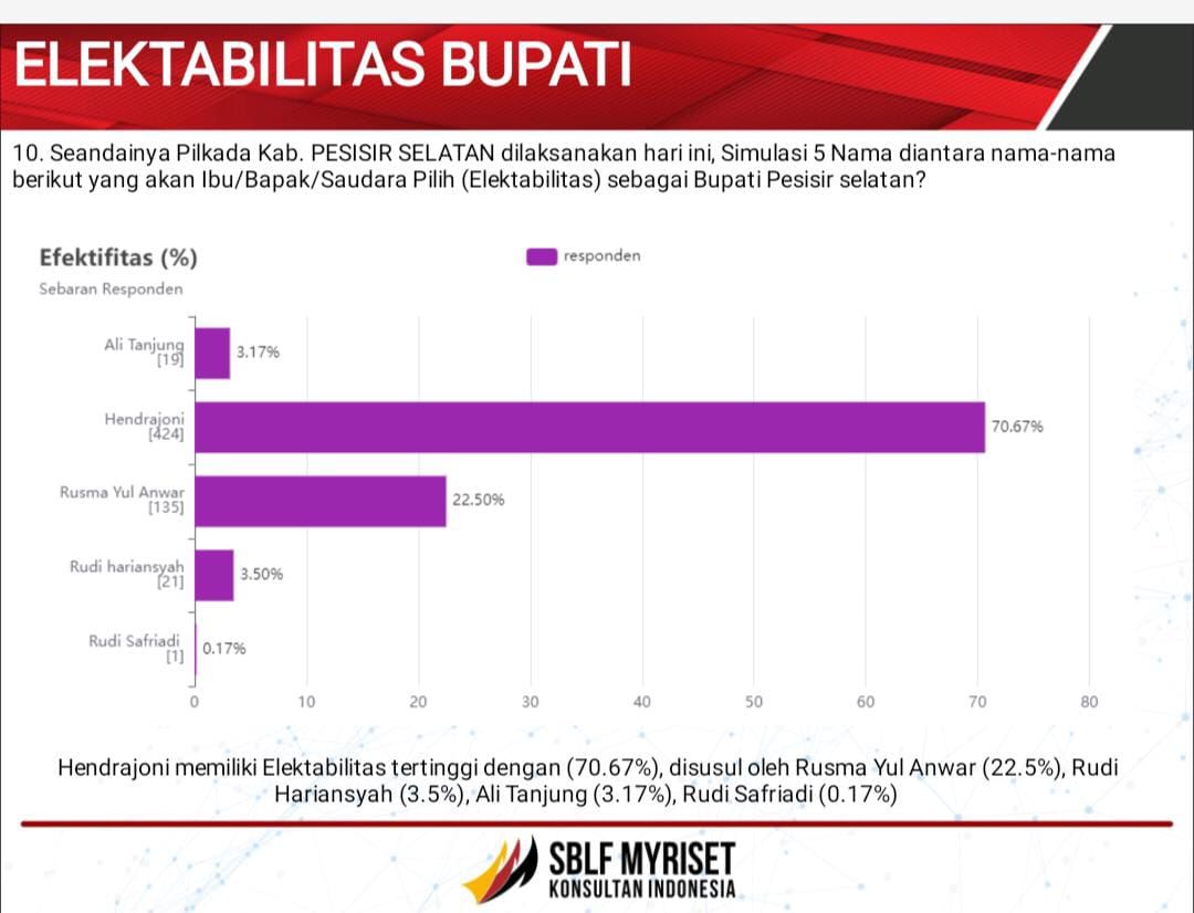 “Saat simulasi 3 calon berpasangan didapatkan elektabilitas Hendrajoni-Risnaldi 69.83%, Rusma Yul Anwar-Rudi Hariansyah 27% & Ali Tanjung-Rudi Syafriadi 3.17%,” kata Edo.