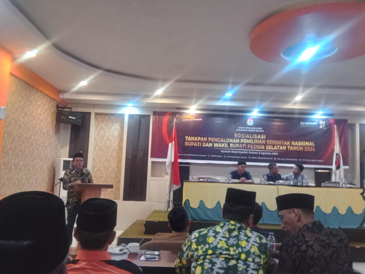 PESSEL METRO–Komisi Pemilihan Umum (KPU) Kabupaten Pesisir Selatan mengadakan kegiatan sosialiasi tahapan pencalonan pemilihan serentak nasional Bupati dan Wakil Bupati Pessel 2024. Selasa (6/8) di aula Hotel Hannah Syariah.