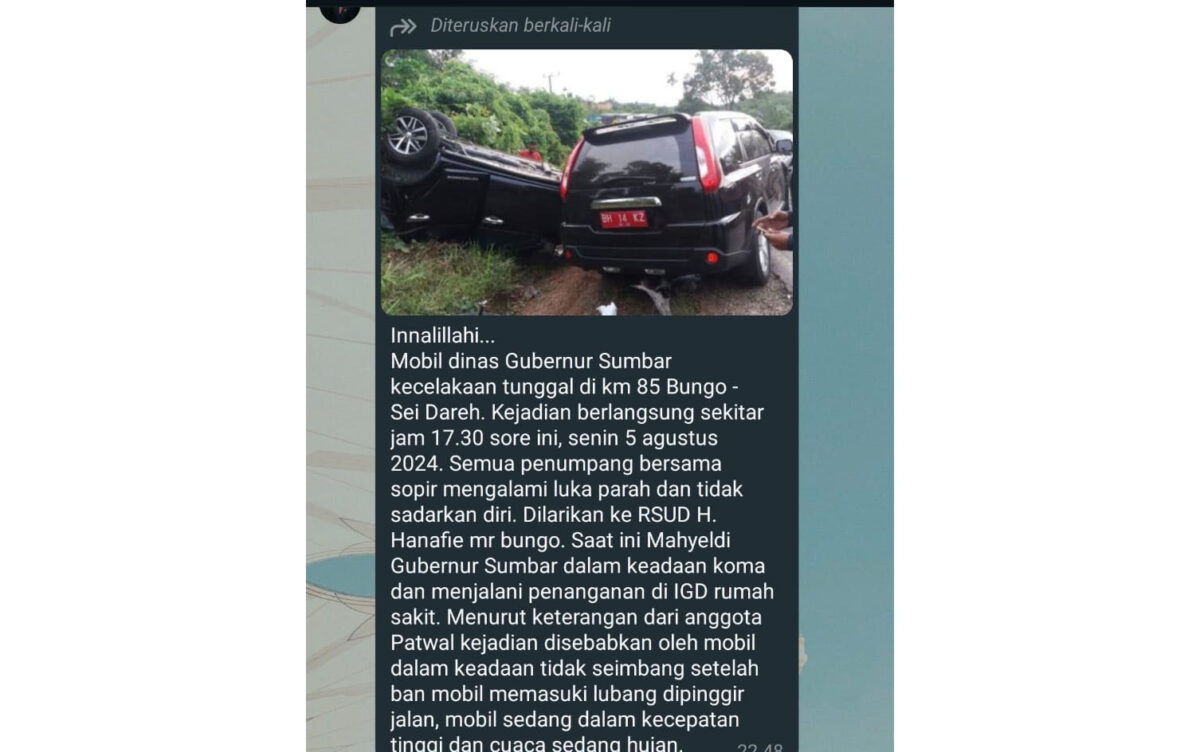 Ada pun pesan berantai via whatsapp yang tersebar adalah sebagai berikut; Innalillahi. Mobil dinas Gubernur Sumbar kecelakaan tunggal di km 85 Bungo – Sei Dareh. Kejadian berlangsung sekitar jam 17.30 sore ini, Senin 5 Agustus 2024.