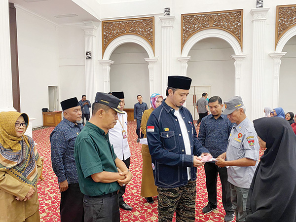 DISTRIBUSI ZAKAT— Walikota Bukittinggi Erman Safar mendistribusikan zakat kepada Mustahik di Kota Bukittinggi, Selasa (6/8).