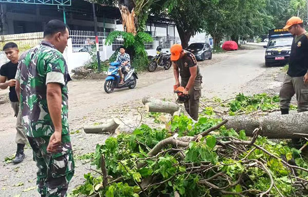 PURUS, METRO–Angin kencang yang terjadi di sebagian besar wilayah Kota Padang, Jumat (9/8) menyebabkan pohon tumbang. Tim Reaksi Cepat (TRC) Satlinmas Pol PP Padang, kemarin melakukan evakuasi pohon tumbang di kawasan Purus II, Kecamatan Padang Barat.