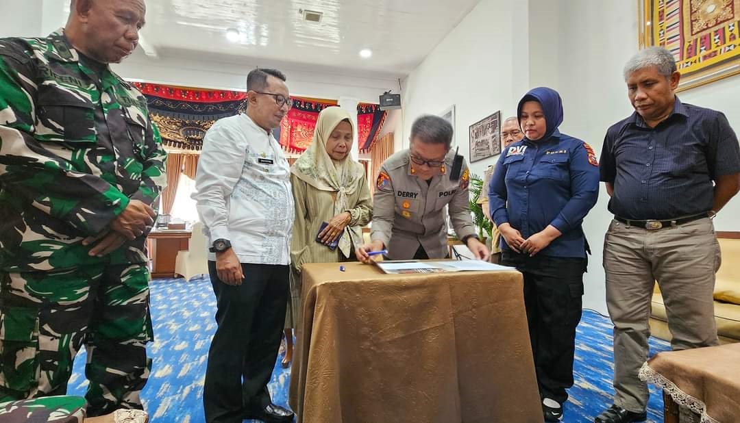 TANDA TANGAN— Kapolres Tanahdatar AKBP Derry Indra menandatangani berkas penyerahkan potongan tubuh korban banjir bandang lahar dingin yang sudah berhasil teridentifikasi kepada pihak keluarga.