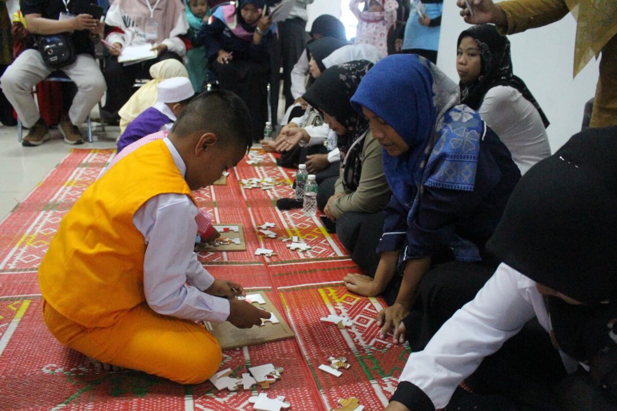BERJIBAKU— Peserta lomba menyusun puzzle dan desain poster antusias mengikuti kegiatan acara dalam rangka memeriahkan HUT ke-79 RI, Senin (12/8).