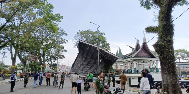 BUKITTINGGI, METRO–Angin kencang yang menerjang Kota Wisata Bukittinggi mengakibatkan atap podium yang berada di Lapangan Kantin roboh dan menimpa satu unit kendaraan roda dua, Selasa (13/8) pukul 11.00 WIB. Beruntung, isnsiden itu tidak menimbulkan korban jiwa.