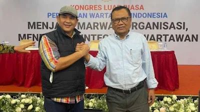 TERPILIH— Ketua Umum PWI terpilih, Zulmansyah Sekedang bersama Ketua DK PWI Sasongko Tedjo