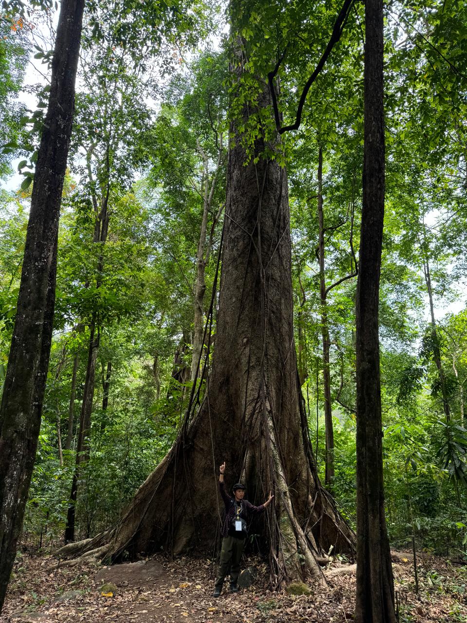 Melanjutkan perjalanan dengan ojek, kami dibawa ke sebuah titik yang terdapat pohon yang mencolok. Disebut pohon benuang laki yang berdiameter 2,25 meter dan tinggi 50-60 meter. Diperkirakan sudah berumur sekitar 70-80 tahu. “Pohon ini istimewa. Sangat kuat dan berumur panjang. Akar tunjang besar dan kuat. Biasa digunakan untuk perkakas rumah tangga. Tapi yang ini tidak bisa ditebang karena berada di hutan lindung,” katanya.
