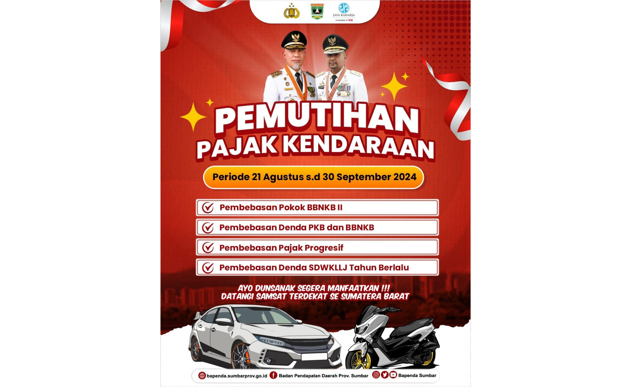 Dimulai 21 Agustus hingga 30 September 2024, Pemprov Sumbar Berlakukan Pemutihan Pajak Kendaraan Bermotor