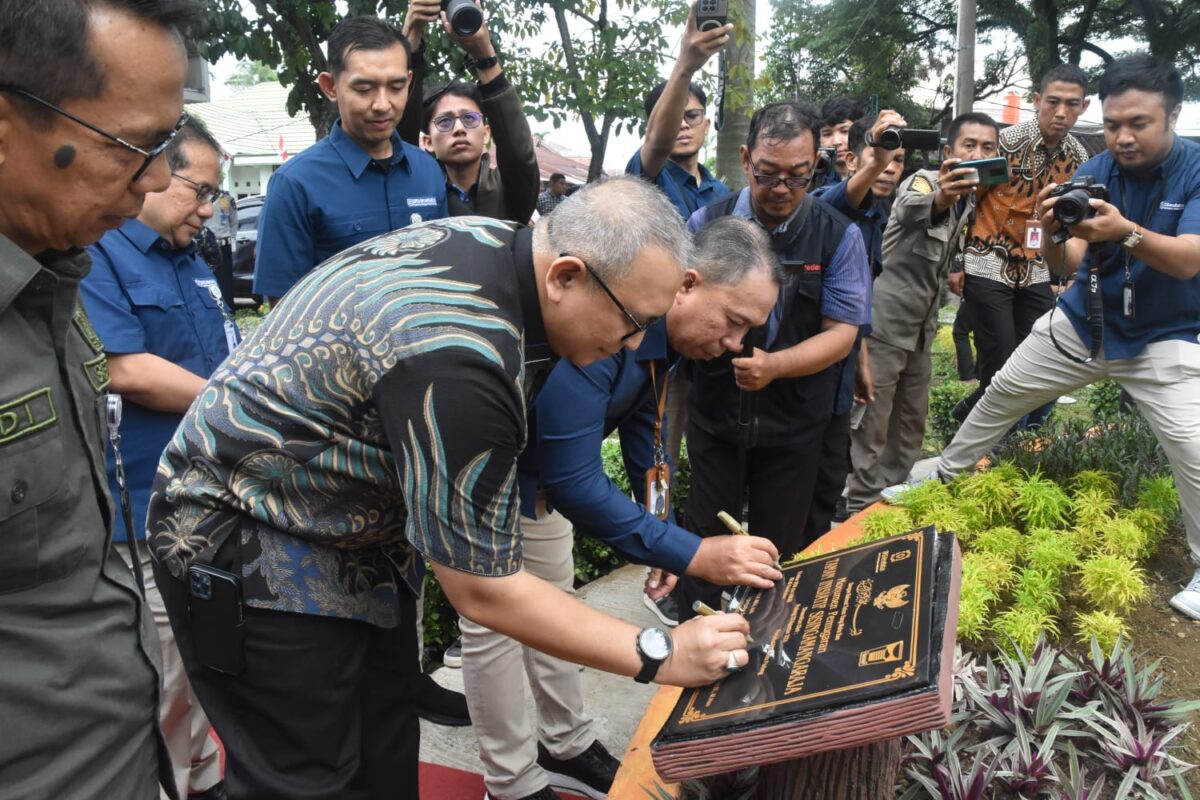 Pj Wali Kota Padang Andree Algamar bersama Direktur SDM dan Umum BPJS Kesehatan Andi Afdal tandatangani prasasti peresmian Taman INISIATIF Sisingamangaraja, Padang, Kamis (22/8).