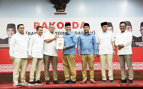 BUKITTINGGI, METRO–Ketua DPD Partai Gerindra Sumbar Andre Rosiade menyerahkan berkas B1-KWK Calon Kepala Daerah Provinsi dan Kabupaten/Kota se-Sumbar dari Partai Partai Gerindra, Sabtu (24/8). Calon Gubernur Sumbar Mahyeldi dan calon Wakil Gubernur Sumbar Vasko Ruseimy menjadi bintang dalam acara yang digelar di di Balai Sidang Bung Hatta, Kota Bukittinggi.