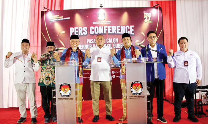 PADANG, METRO–Pasangan Calon Gubernur (Cagub) dan Calon Wakil Gubernur (Cawagub) Sumbar Mahyeldi-Vasko Ruseimy resmi didaftarkan partai pengusung ke Komisi Pemilihan Umum (KPU) Sumbar. Pasangan yang diusung oleh lima partai politik, PKS, Gerindra, Demokrat, Perindo dan PBB tersebut mendaftar Selasa (27/8) siang.