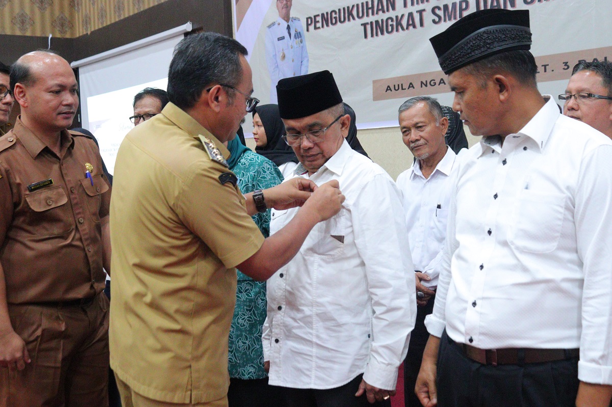 SEMATKAN— Pj.Wali Kota Payakumbuh Suprayitno, menyematkan pin kota sehat saat pelantikan forum kota sehat.